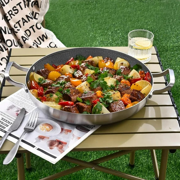 Inqibee 14 inch New Hybrid Tri-Ply Stainless Steel Paella Pan with Lid,Omelet,Griddle,Large Skillet,Induction Cooking Pan,Dishwasher and Oven Safe.